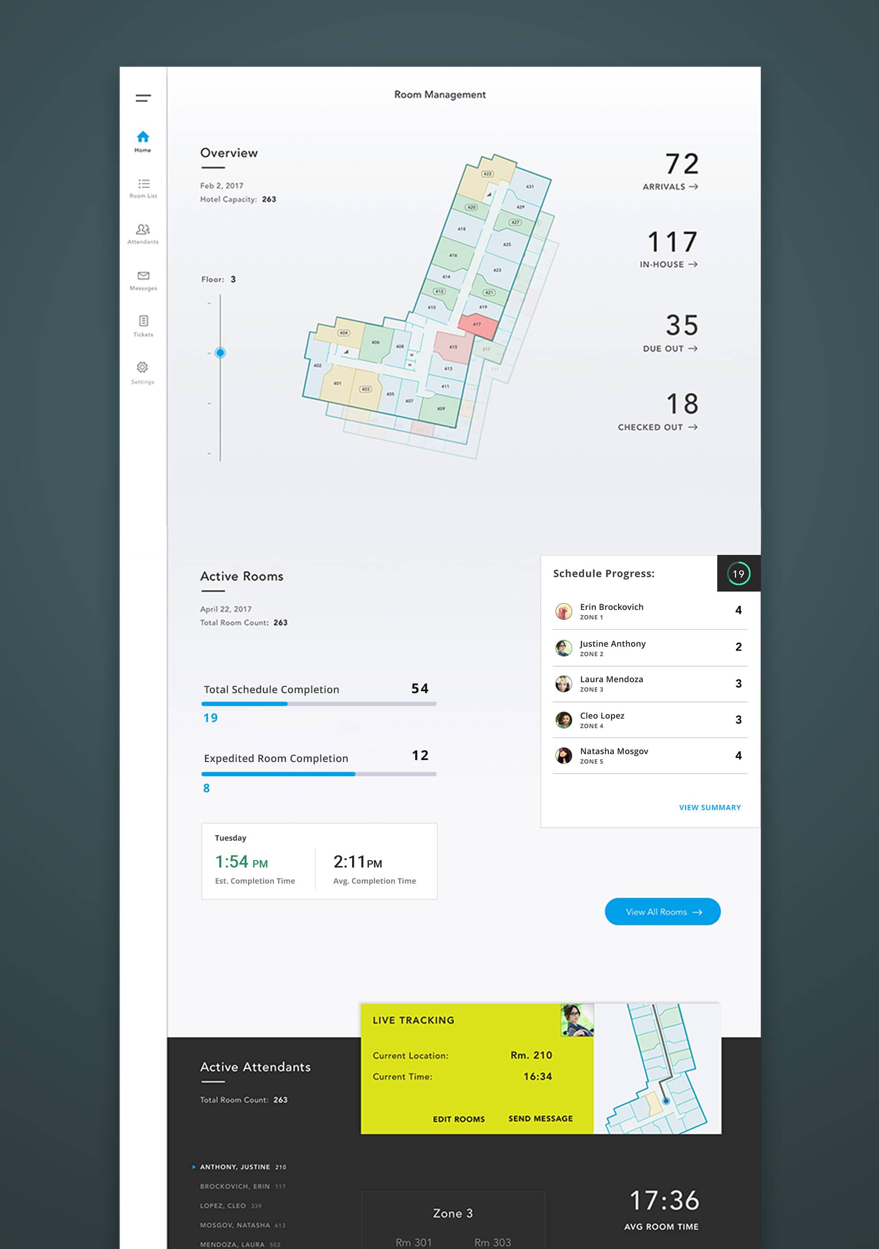 The home screen hierarchy includes informative insights for general hotel status, scheduled room completion, active attendants, and lost and found to quickly see and act as needed.