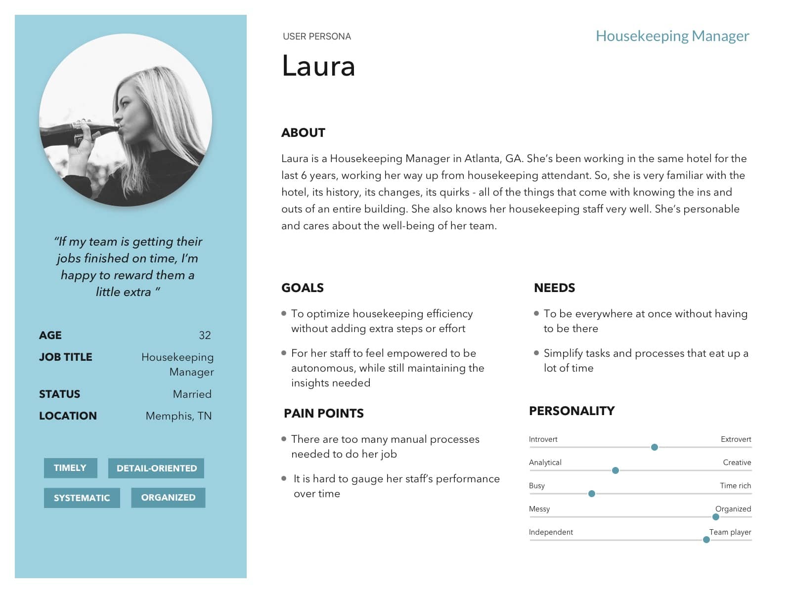 Over the course of the following week, the interviews conducted were consolidated and analyzed to create two user personas: housekeeping manager and housekeeping attendant. We only spoke with one maintenance employee briefly, but their actual workflow was very similar to the attendant.
